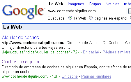 Hasta ahora cuando alguien buscaba una web en concreto en Google, como por ejemplo www.cochesdealquiler.com, Google mostraba un único enlace para ir a esa página en concreto.